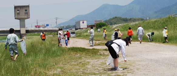 | 楽しく学んだあとは、河川敷のごみを拾いました。拾う心と捨てない気持が大切ですね。きれいになりました。 | |