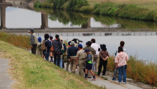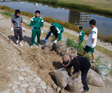 | 10月14日(日)「第25回 I LOVE遠賀川」が開催、約2500人が遠賀川中の島河川敷に集いました。今年度は25回記念事業として、飯塚宿場太鼓・鼓楽塾の演奏や遠賀川宝探等が行われました。 早朝、日本野鳥の会筑豊の皆さんの呼びかけで行われた「野鳥観察会」は遠賀川に生息する野鳥や野の虫達を観察。鳥たちのさえずりを聞きながらゆっくりと中の島を散策しました。10時から開会式、終えると参加者はそれぞれのコースに分かれて、ゴミ拾いや石組みに生えた草を取り除いていました。昼食は実行委員会提供の「おにぎり」、飯塚市役所職員組合のご協力で「みそ汁」、池坊飯塚橘支部千種会のご協力で「だご汁」を楽しみました。その後、参加者の皆さんは野点(裏千家淡交会)、吹奏楽演奏(近畿大学産業理工学部・付属福岡高校・嘉穂東高校)に合わせて踊るなど楽しいステージとなっていました。また、100人が安心して乗れる川船試乗会も行われ、優雅に流れる船に乗って川の水面を楽しんでいました。また、パネル展示ではゴミの実態写真や水質検査・水環境の大切さを展示していました。 曽根ILOVE遠賀川実行会委員長より「遠賀川からのお礼のメッセージ」が披露され、「中の島の河川敷では本当にゴミを見かけなくなりました。遠賀川はきれいになりました。鮭やアユも帰ってきつつあります。しかし、遠賀川はとても長く、下流の芦屋海岸にはたくさんのゴミが流れ着きます。遠賀川全体がきれいになるよう頑張りましょう」と話されました |