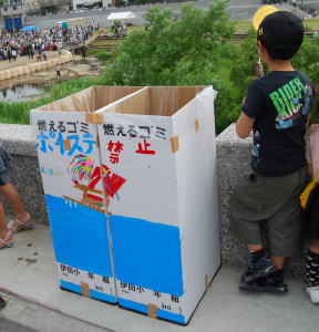 | 伊田小学校の児童が作った手づくりのゴミ箱。ゴミが捨てられていました、 |