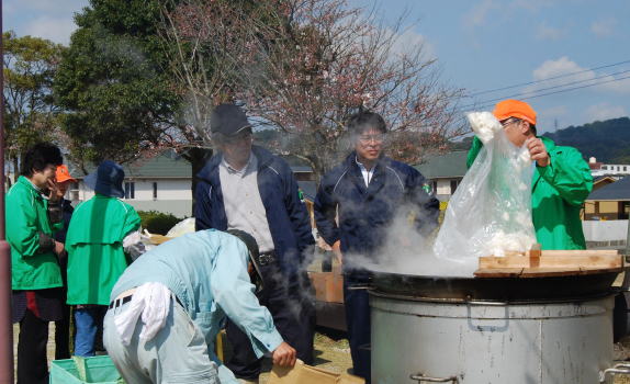 彼岸花の球根よりたくさんの人に集まっていただきありがとうございました。作業はすぐ終わることと思いますが、桜を見ていただいたり、河川敷で遊んでいただくなどゆっくりしてください。本日は市民バンド‟ブルーウエーブ”の1960年代のオールディズからフォークソング、ダンスミュージックを踊って歌って楽しんでください。また、豚汁の準備もしています。大鍋でたくさん準備していますのでお代わりもありますのでたくさん食べてください。