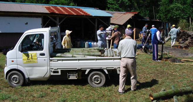 | 竹をトラックの荷台に積みます。企業の皆さんがトラックに竹をのせて、炭焼き小屋まで運んでいただきます。 | |