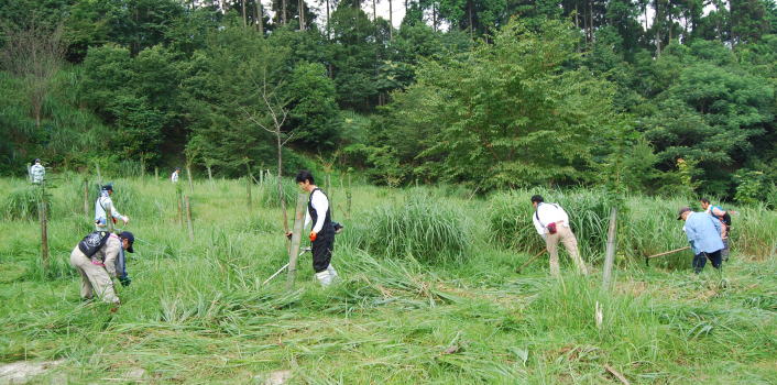 | ヲヲガノンの様子 ヲヲガノン地区は西馬見区有地から50分かけて登ったところにあります。木々は大きく成長しているということですが、登るまで大変。そして作業、終えて下山。今回75名の方がヲヲガノン地区で作業をされたということです。 本当にお疲れ様でした。昨年は草刈りが中止となっていたので、刈るのに力がいりました。若い人は本当に戦力になります。 |