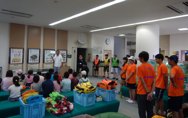 8月7日(火)飯塚片島交流ンターの子ども達が飯塚市防災センターで、遠賀川河川環境学習会、水生生物調査・地震体験をしました。また、センターに野外展示されている川ひらたウィ見学しました。