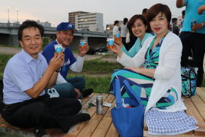| かっての賑わいを失ってしまった日本の水辺の新しい活用の可能性を、創造していくプロジェクトが水辺で乾杯ミズベリング・プロジェクトです。 ミズベリングは「水辺+RING(輪)」、「水辺+R(リノベーション)+ING(進行形)」の造語。水辺に興味を持つ市民や企業、そして行政が三位一体となって、水辺とまちが一体となった美しい景観と、新しい賑わいを生み出す取り組みが広がっています。 飯塚市、遠賀川と穂波川が合流する中之島、芳雄橋下で7月5日午後7時7分、「遠賀川と飯塚河川敷を市民の憩いの場にしよう会」の呼びかけで飯塚河川敷で商店街の皆さん、飯塚病院、近畿大学、商工会議所、市役所などの皆さんが青い物を身につけて集まってきました。 「遠賀川と飯塚河川敷を市民の憩いの場にしよう会」の皆さんは発足しての最初の企画となります。つながりを求めて会場ではたくさんの乾杯で笑顔!と笑顔!。水面に映る夕暮れのひと時を楽しんでいました。 |