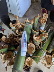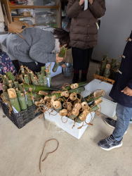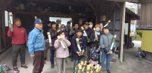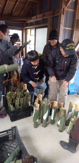 元旦に遠賀川源流広場の源流水を汲んで(嘉麻市桑野の嘉麻峠手前)無病息災を祈念する若水汲みが毎年行われています。新年を迎え、広場では、初日の出を拝んだ皆さんなどが竹水筒に若水を汲んで持ち帰っていました。広場の東屋には。12月29日に同会の皆さんが作った竹水筒が置かれ、みなさん若水を汲んでいました。
