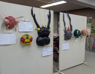 完成したお面は、会場にずらりと展示され、「むしのお面展示会」が開かれました。来場者たちは、「これはなにむし?」「すごい!ほんものみたい!」と、子どもたちの想像力あふれる作品に見入っていました。