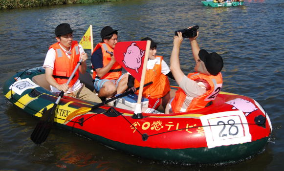 | 「第36回遠賀川川下り大会」が8月2日、飯塚市の芳雄橋付近から直方市の菜の花大橋付近までの遠賀川約21キロで開かれ県内各地からイカダ部門、舟の部門、24チーム285人が参加した。
